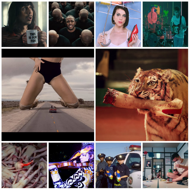 Necesariamente la industria musical estadounidense acapara la calidad y cantidad de los videos que se encuentran en línea. Habría que escarbar mucho en la red para encontrar muchos más buenos videos de otras latitudes. Para este año se siguen destacando el compromiso de artistas como Kendrick Lamar y St. Vincent por hacer, no uno, sino varios videos sobresalientes. El hip hop sigue aportando muchas de las ideas originales y potentes de esta expresión audiovisual, así como se pueden encontrar tendencias recurrentes en su creación, como los videos que apelan a una narrativa o estética de programa televisivo o los que aprovechan las posibilidades formales y discursivas de la interactividad, las redes sociales y los nuevos medios.