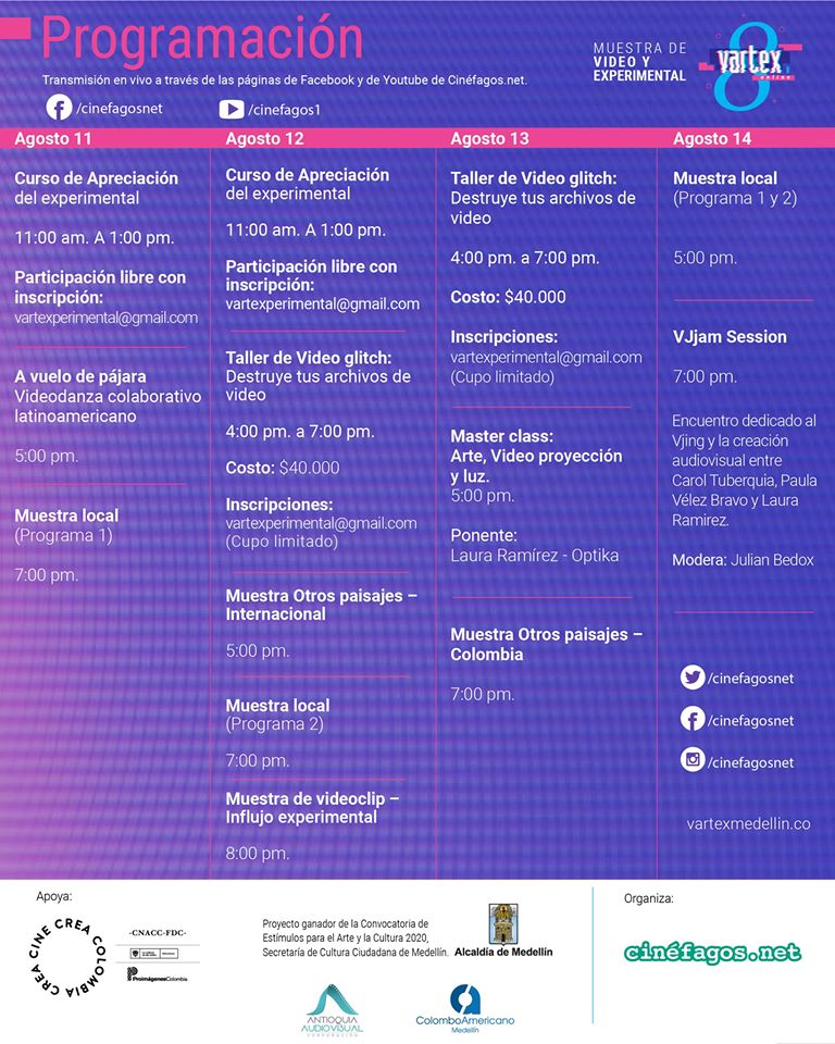 Del 11 al 14 de agosto se realizará VARTEX 8: Muestra de Video y Experimental de Medellín, esta vez en su versión online. Este año traemos una programación diversa que reúne cuatro muestras de exhibición, dos talleres de formación, una master class y una VJ Jam Session Online.