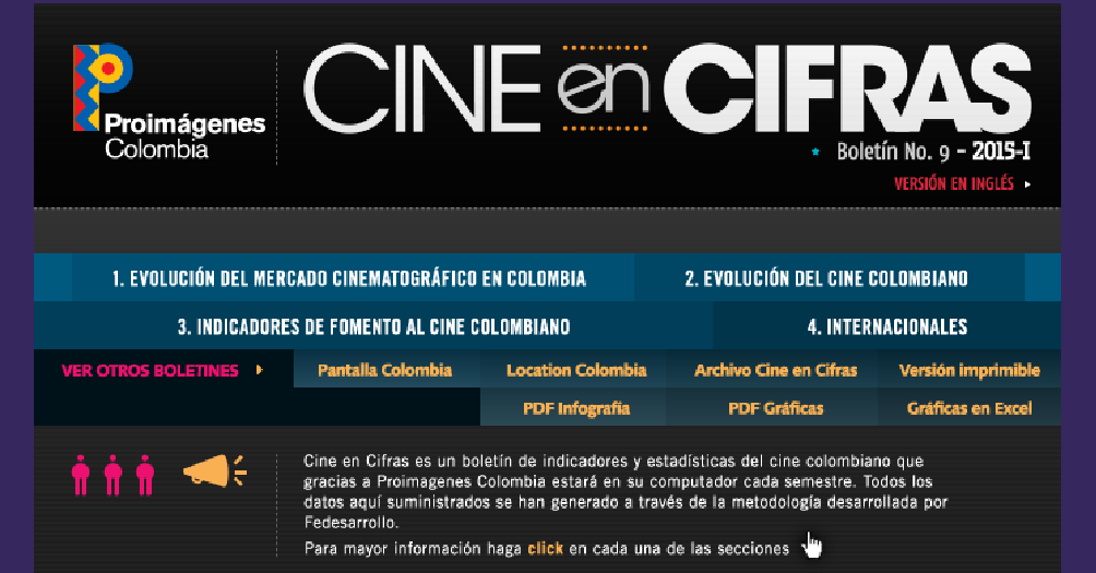 Conozca las cifras e indicadores completos del Boletín “Cine en cifras” No. 9 en http://bit.ly/1g2hwiQ, y suscríbase para recibirlo semestralmente, junto a otros contenidos especiales de Proimágenes Colombia, en: http://bit.ly/1NakeQw.