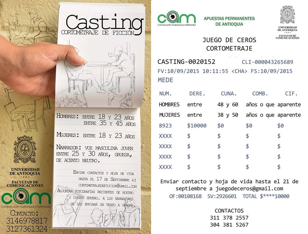 Actualmente, dos proyectos de cortometraje se encuentran en el proceso de convocatoria de actores para casting: Juego de ceros, dirigido por Alejandra Uribe, y Cortometraje de ficción de Heider Vargas. “Es importante poder encontrar a los actores adecuados para interpretar los diferentes personajes, no solo para que el público crea en la historia que se cuenta a través de su caracterización, sino porque finalmente serán la cara del cortometraje”, afirma Eliana Banquett, una de las productoras de Juego de ceros.