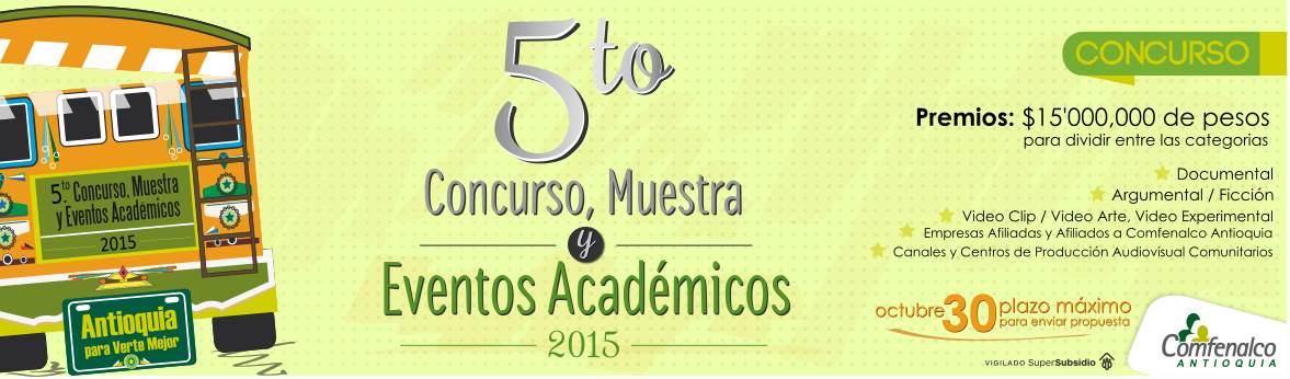 El concurso entregará un total de 15 millones de pesos en premios a las mejores obras en 5 categorías: Documental, Argumental, Video clip, video arte y video experimental, Obras de canales y centros de producción audiovisual comunitarios y Obras de empresas afiliadas y afiliados a Comfenalco Antioquia.