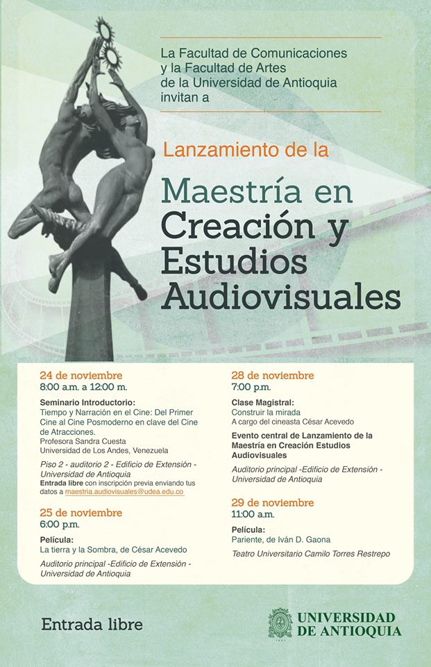 Entre el 24 y 28 de noviembre la Universidad de Antioquia realizará una serie de actividades de lanzamiento de su Maestría en Creación y Estudios Audiovisuales, pionera en investigación audiovisual en la región. La nueva Maestría es fruto de una década de trabajo de profesores de la Facultad de Comunicaciones y la Facultad de Artes, proceso en el que se propuso crear un posgrado con enfoque de investigación- creación.
