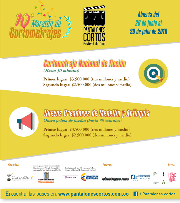 Durante diez años, la corporación Dunak Kuzmanich ha realizado Pantalones Cortos, un evento cinematográfico de formación y proyección de cortometrajes de ficción a nivel nacional y local. Este año, la convocatoria estará abierta hasta el 20 de julio. Se recibirán cortometrajes de ficción realizados desde el primero de enero de 2017, que hayan sido producidos en Colombia o por ciudadanos colombianos residentes en el exterior.