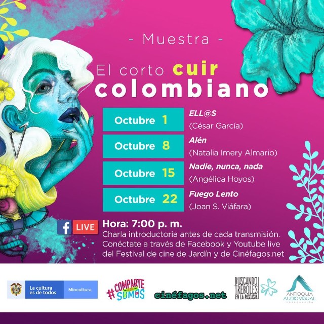 Luego de finalizar con éxito el 5º Festival de cine de Jardín, cuyo tema para esta edición fue el cine cuir, continuamos con un programa post festival, ahora en alianza con el espacio Buscando Tréboles y gracias al apoyo de la Convocatoria Comparte lo que somos: El arte, la cultura y el patrimonio, del Ministerio de Cultura. Durante todos los jueves de septiembre y octubre se presentará una retrospectiva del corto cuir en Colombia acompañada de charlas introductorias.